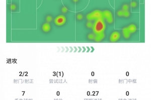 出场63分钟,进1球,射门2次,射正2次,尝试过人3次成功1次,丢失球权7次,预期进球0.27