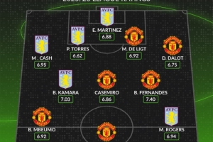 后卫:卡什(维拉,6.95分)、保·托雷斯(维拉,6.62分)、德里赫特(曼联,6.92分)、达洛特(曼联,6.75分)