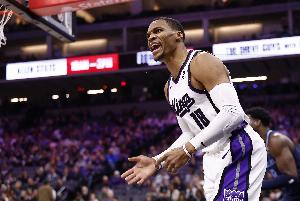 体育资讯12月22日讯 NBA常规赛,国王在主场以125-124加时击败火箭,赛后威少接受记者采访。