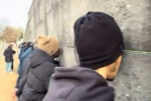 法国杯1/32决赛,法丙球队布尔格主场0-6马赛。球迷晒出视频,球场外一排球迷扒墙缝看球。