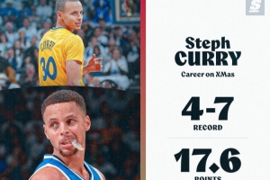 据统计,库里生涯至今共出战11次圣诞大战,战绩为4胜7负,期间场均可以得到17.6分6.4助攻,三分命中率仅28%。