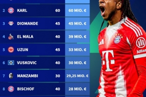 体育资讯12月26日讯 德国转会市场盘点了2025年德甲身价涨幅榜,拜仁两将奥利塞、伦纳特·卡尔分别上涨6500万欧和6000万欧位居前二。