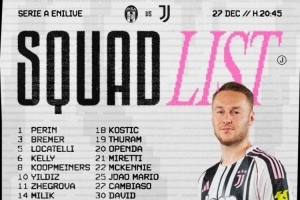 体育资讯12月27日讯 北京时间明天凌晨,尤文将在意甲第17轮比赛中客场对阵比萨,尤文公布了此役的球员名单。孔塞桑、卡巴尔、鲁加尼、弗拉霍维奇缺席。