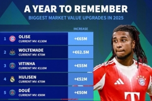 体育资讯12月30日讯 2025年即将结束,《转会市场》也统计了本年度身价上涨幅度最大的球员,奥利塞力压沃尔特马德居首。