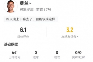以上就是本文的全部分享,关于《费兰·托雷斯本场1射0正+1失良机 0关键传球+1对抗0成功 仅6.1分》的更多内容我们将继续跟进。