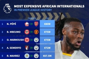 体育资讯1月9日讯 伯恩茅斯前锋塞梅尼奥以7200万欧元的价格加盟曼城,根据德转统计,他成为英超历史上转会费第四高的非洲球员,仅次于尼古拉斯·佩佩、姆伯莫和马尔穆什。