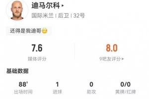 以上就是本文全部内容,关于《迪马尔科本场1球+16丢失球权 5传中1成功+4长传0成功 获7.6分》的更多信息我们将继续跟踪。
