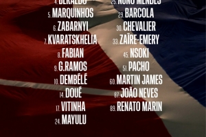 前锋:7-克瓦拉茨赫利亚、 9-贡萨洛·拉莫斯、10-登贝莱、14-杜埃、29-巴尔科拉