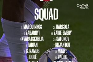 巴黎对阵毕巴大名单:杜埃、努诺·门德斯回归,登贝莱缺席