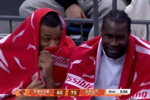 终场前3分58秒,北京以72-82落后,当转播方镜头给到场边北京两名外援时,斯佩尔曼和马帝昂的脸上都洋溢着笑容,前者还边说话边捂嘴笑。
