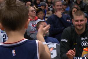 GIF-小球迷挥手打招呼 约基奇微笑回应