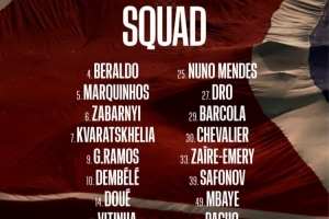 中场:17-维蒂尼亚、19-李刚仁、24-马尤卢、27-德罗·费尔南德斯、33-扎伊尔·埃梅里、87-若昂·内维斯