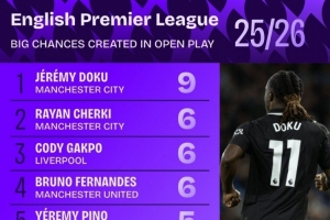 以上便是关于《本赛季英超运动战创造重大机会榜:多库9次居首,B费、谢尔基6次》的最新解读,若你想了解更多赛况分析,欢迎继续访问本站。